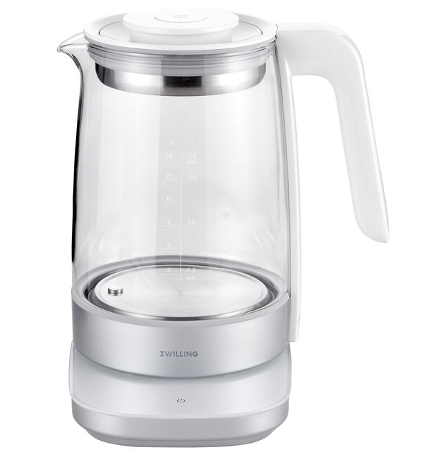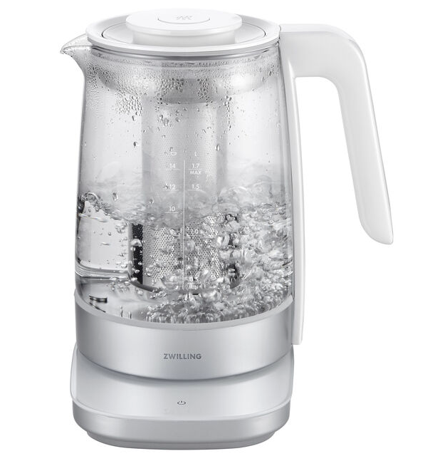 ZWILLING Enfinigy 1.7 L, Glass Kettle - Silver Pour yourself the perfect cup with our electric kettles. This beautiful, durable borosilicate glass kettle is a powerful 1500-watts and offers a generous maximum capacity of 1.7 liters. It features precise temperature control, 6 pre-set temperature programs, a 30-minute keep-warm function and a handy tea steeping timer. The stainless-steel steeper can be inserted to prepare your favorite tea directly in the kettle. When removed it can be placed on the included drip tray to avoid messes. The docking base boasts a handy cord storage for a clean, minimal design that keeps your countertop looking as sleek as the appliances on it. Durable borosilicate glass body Double-sided measuring line, max capacity 1.7 liters Stainless-steel steeper to prepare your favorite tea directly in the kettle 6 pre-set temperature control options along with a tea timer, that measures 0 - 10 minutes, and a 30-minute keep-warm function Developed by ZWILLING in Germany, designed in Milan, Italy by Matteo Thun & Antonio Rodriguez Docking base with touch control and a hidden display when powered off Integrated cord winder for convenient storage The longest warranties in the industry
