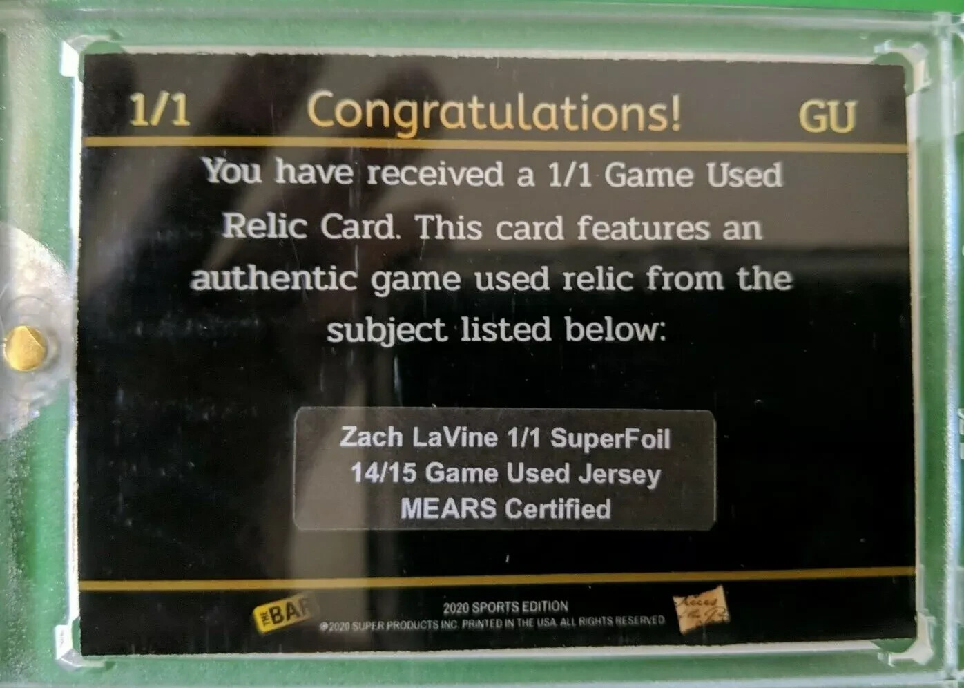 This is a 2019-20 Panini Mosaic Zach LaVine 1-of-1 Game Used Relic card featuring a piece of game-worn memorabilia from the Chicago Bulls player. The card is a gold parallel variety with a 1st Edition stamp, making it an original release. It is a single card made of card stock in English, part of the Panini Mosaic series for the 2019-20 NBA season.