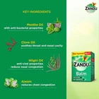 c l Zandu Balm is India's Largest Selling Multipurpose Pain Relief Solution that has effectively won the trust of generations. It is extracted from responsibly sourced pure Ayurvedic ingredients. The balm is non- greasy and penetrates swiftly into the affected areas to help deliver quick and long-lasting relief from pain. It’s analgesic properties help relieve the pain effectively. A pain can completely put you off focus for the entire day. Which is why you need a reliable solution that will relieve a pain in the most convenient manner. Powered by ayurvedic ingredients like menthasatva & eucalyptus helps treat different kinds of topical pains. Gaultheria oil acts as a counter-irritant to relieve muscle pain. Mentha present in the balm enhances the cooling effect and helps to soothe the affected area. So bank on the 100 years of trust of the new and improved Zandu Balm ,which spreads easily and absorbs faster on the skin. It gives instant & long-lasting relief from different kinds of pain. Ek Balm Teen Kaam Headache: Helps relieve headaches effectively. Cold: Effective relief from cold. Backache: Helps relieve lower backache easily. Ayurvedic Balm Zandu Balm An ayurvedic formulation of powerful essential oils and methol, aajwain & eucalyptus for quick relief from headache, backache and cold. Direction for use: For external use only. Apply on pain points and do not rub on the skin. Caution: For adults & children above 5 years. Keep out of reach of children below 5 years. Replace cap tightly. Avoid contact with eyes, nostrils, mucous membranes and broken or irritated skin. Consult a doctor if condition worsen. Do not apply on open wounds. Do not use if allergic to any ingredient. l Headache: Helps relieve headaches effectively. Cold: Effective relief from cold. Backache: Helps relieve lower backache easily. Ayurvedic Balm Zandu Balm An ayurvedic formulation of powerful essential oils and methol, aajwain & eucalyptus for quick relief from headache, backache and cold. Direction for use: For external use only. Apply on pain points and do not rub on the skin. Caution: For adults & children above 5 years. Keep out of reach of children below 5 years. Replace cap tightly. Avoid contact with eyes, nostrils, mucous membranes and broken or irritated skin. Consult a doctor if condition worsen. Do not apply on open wounds. Do not use if allergic to any ingredient.