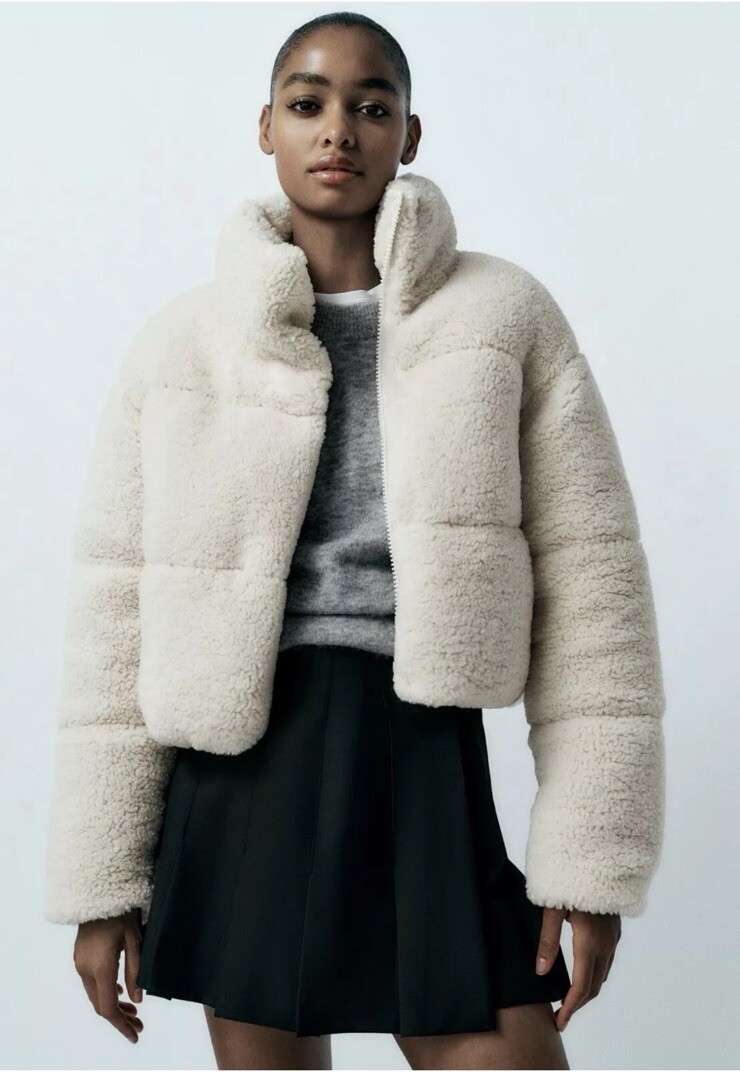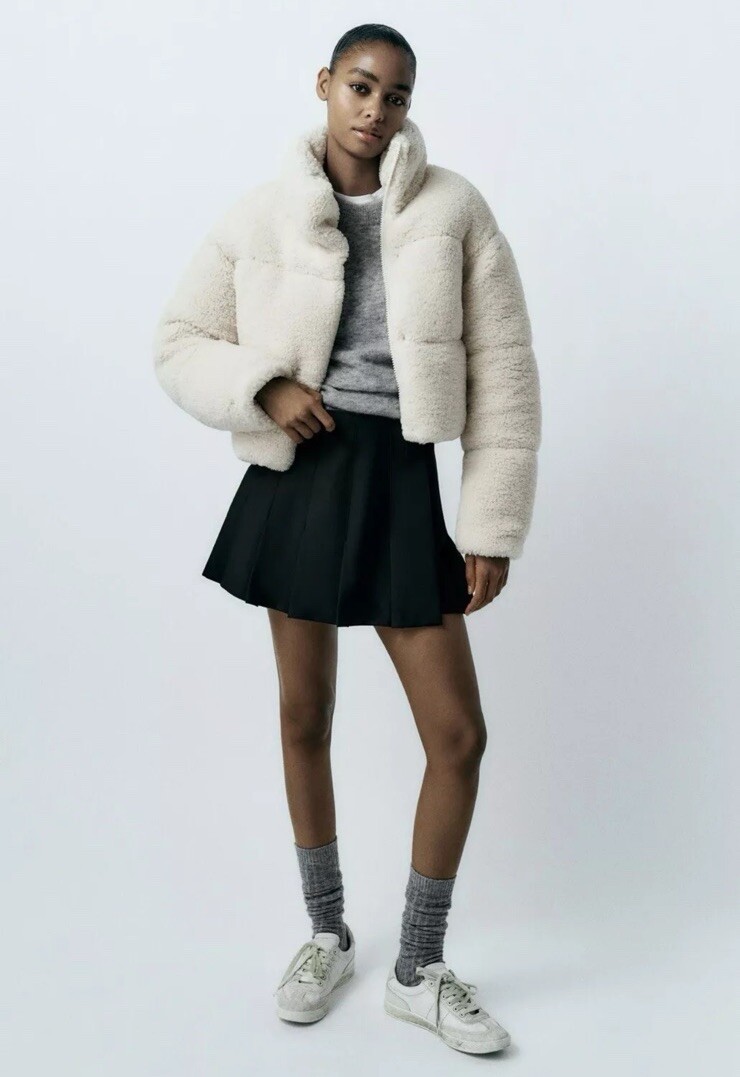 Add a stylish touch to your winter wardrobe with this Zara FAUX SHEARLING PUFFER ANORAK. The anorak is made of high-quality shearling material that provides warmth and comfort. It comes in a size S and features a regular fit for women. The anorak is designed with a unique style that makes it stand out from other jackets. The ECRU colour of the anorak is perfect for any outfit, making it a versatile addition to your wardrobe. Ideal for casual and formal occasions, this anorak is a must-have for any fashion-conscious woman.