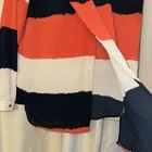 This Zara Basic Collection Stripe Blouse features a boat neckline and button front closure, making it easy to wear for various occasions such as travel, parties, casual outings, or business settings. The medium-sized blouse is made of lightweight chiffon fabric with pleated accents and a colorful Black,Beige,Orange horizontal striped pattern. It has long sleeves and a collarless design, perfect for all seasons. Additionally, the blouse is breathable, unlined, and packable, offering comfort and style with a touch of classic and colorful theme.