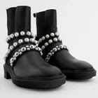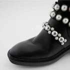 New without tags. Super chic black leather chelsea boots by ZARA featuring 3 scalloped straps covered in large round pearl studs. The lowest strap also features chrome studs surrounded by smaller pearl studs. Low block heel Genuine leather Chelsea style Mid-length, above-ankle boot Size: 37 (US 6½)
