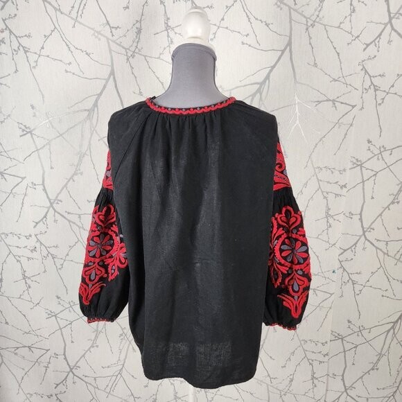 Zara Black Red Embroidered Lantern Sleeve Boxy Fit Peasant Top style tags: colorful, artsy, loose, bohemian, peasant, whimsigoth Women's S Chest: 25" Length: 24" Good used condition: no rips, marks or stains.