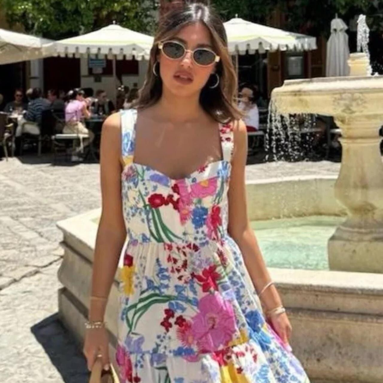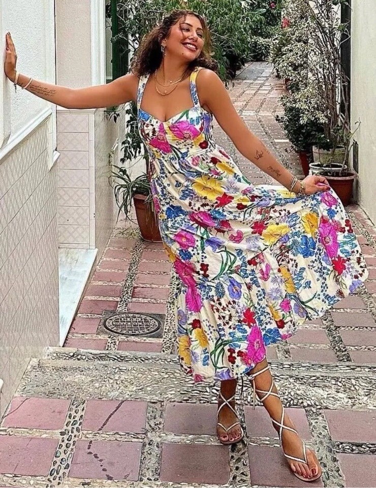 Embrace the floral charm with this Zara Floral Print Strappy Midi Long Dress, a versatile addition to your wardrobe. The dress features a vibrant mix of white, yellow, blue, green, pink, and purple hues, perfect for making a statement at any event. With a size S v and a straight neckline, it's designed to flatter while ensuring comfort. The wide straps and light, breathable blend of cotton and viscose offer both style and ease. Whether you're headed to the office, attending a cocktail party, or simply enjoying a casual day out, this dress is adaptable for numerous occasions. Its midi length strikes a balance between elegance and practicality, suitable for spring through to winter seasons. This multicoloured floral dress is a testament to Zara's commitment to combining fashion with functionality.