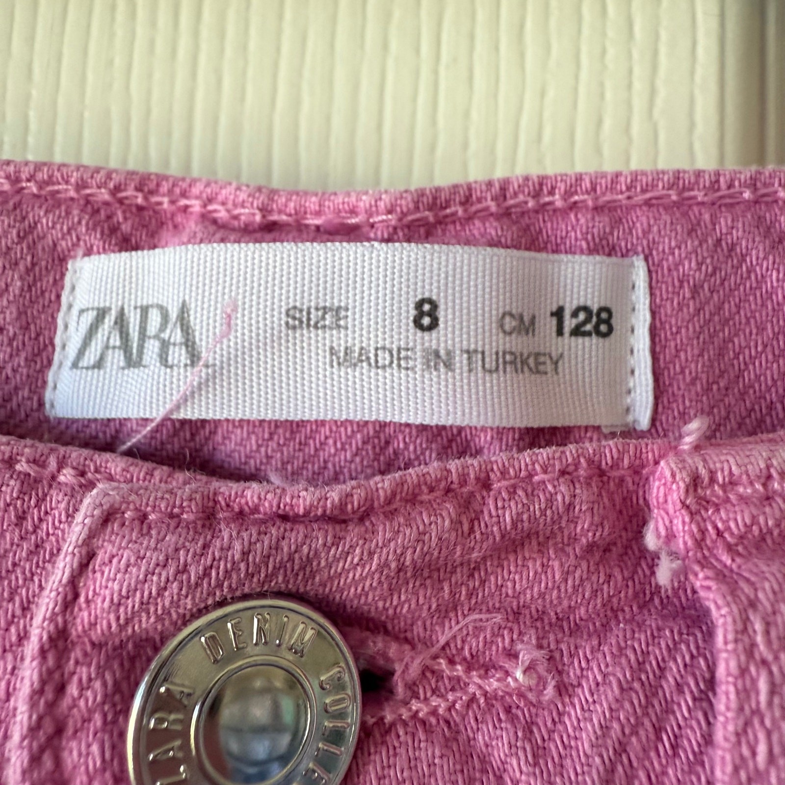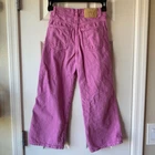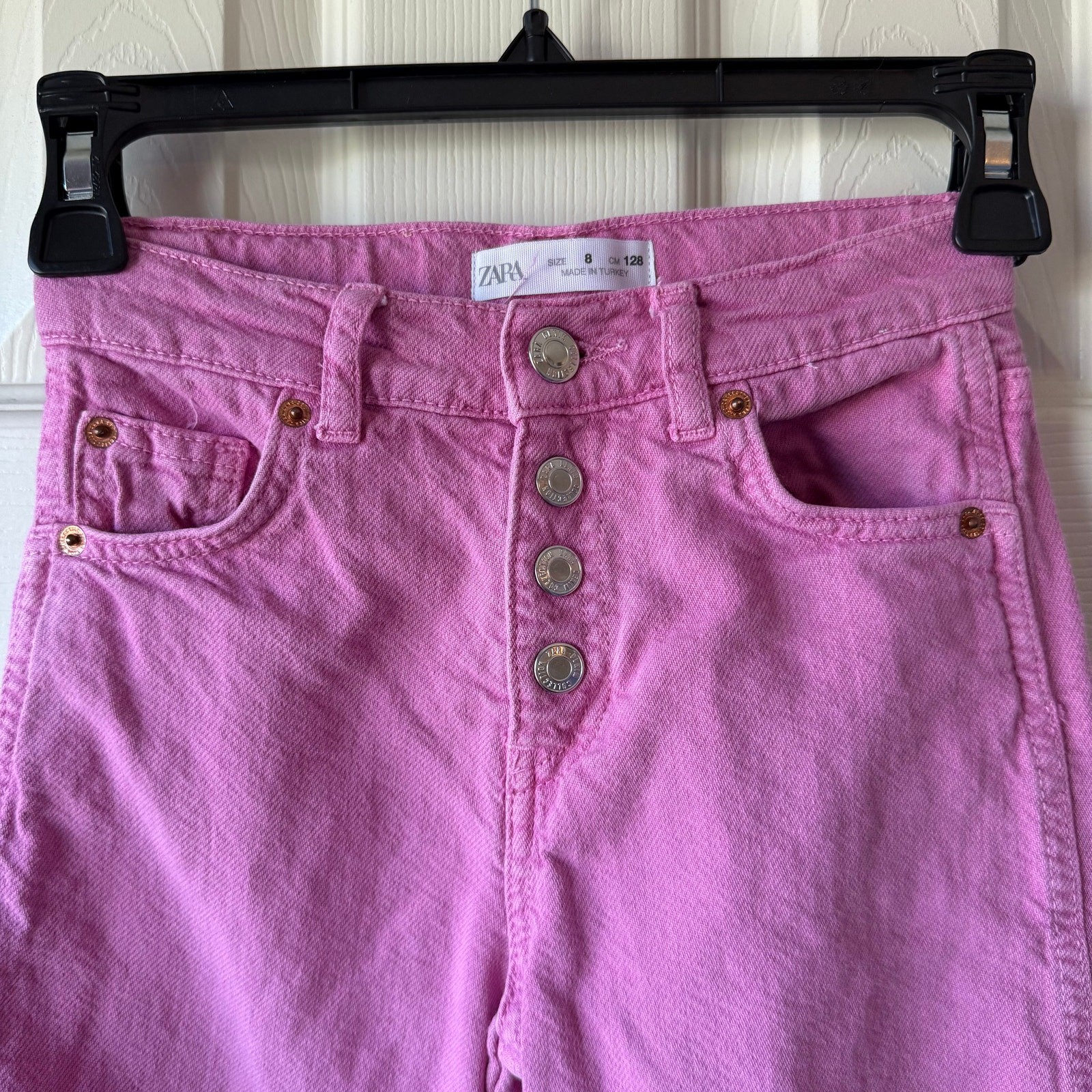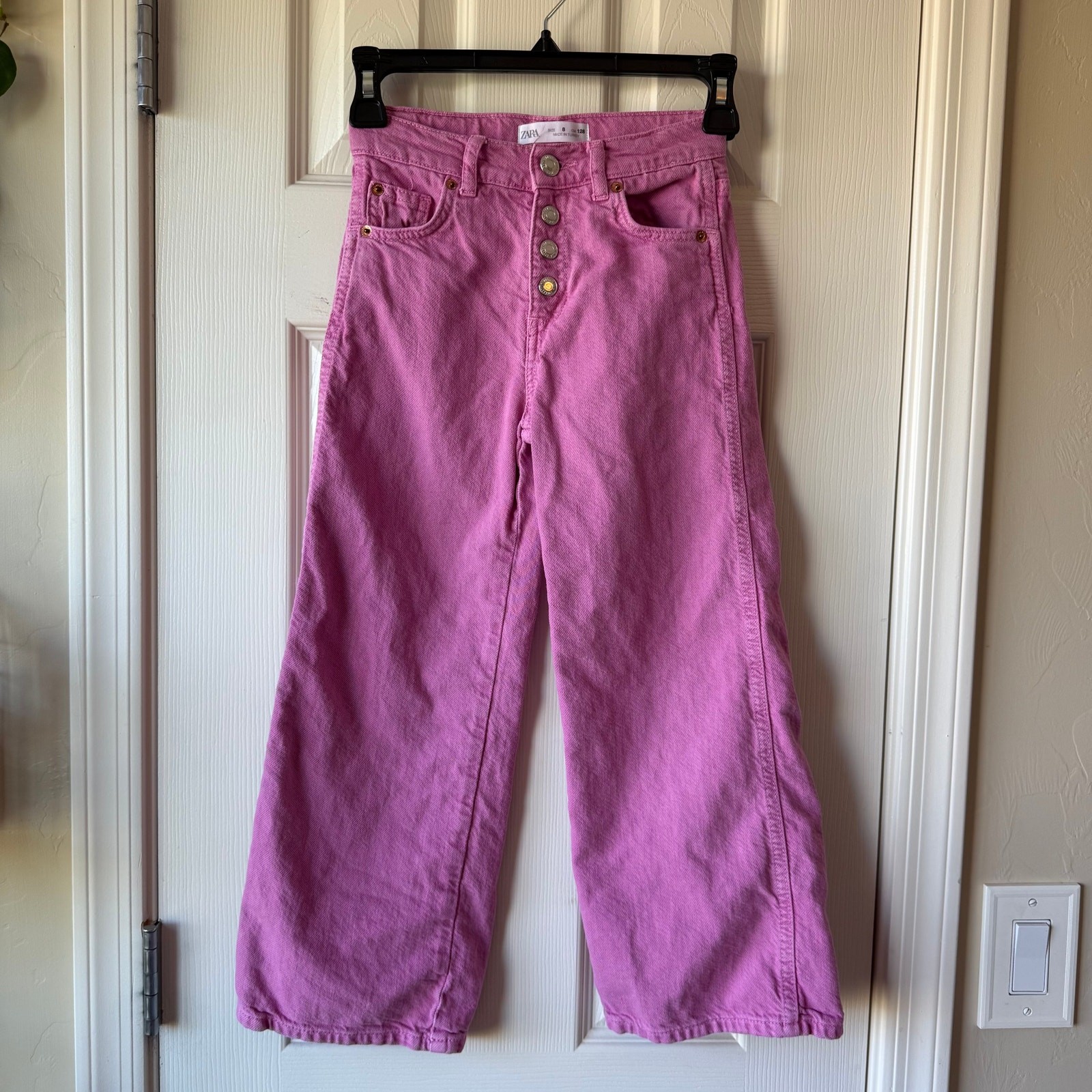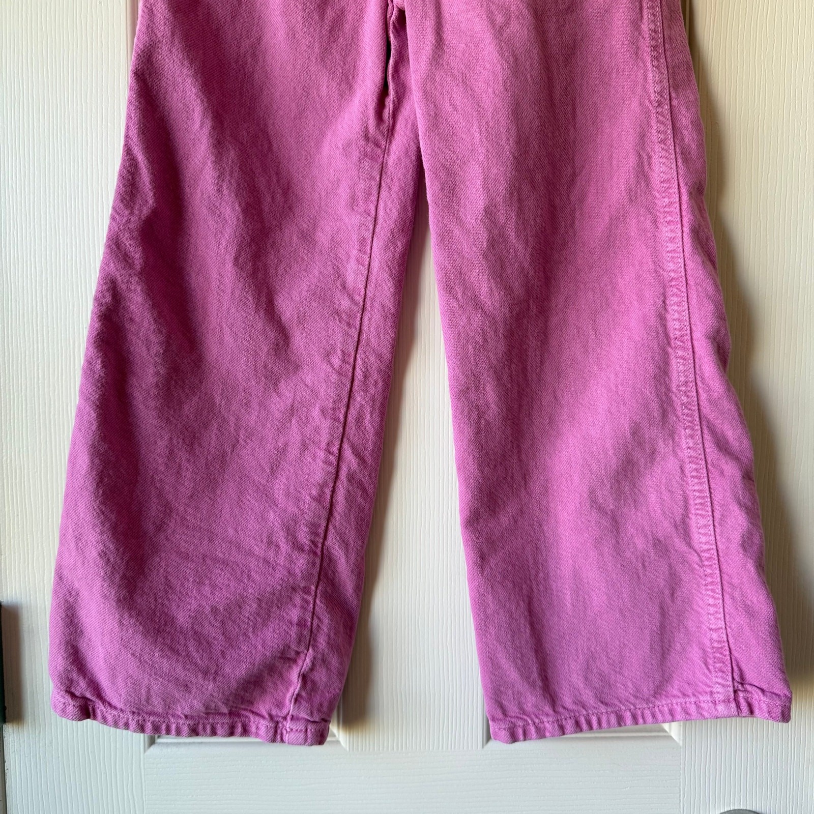 Size 8 (128 cm) Zara Girls Bubble Gum Pink wide leg jeans. Button snap fly. Adjustable waistband. Good/fair used condition for light wash wear. I dont see any stains. So cute! D-4412