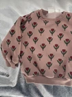 The Zara Kids Little Girl Size 4 Tulip Crewneck Sweatshirt is a stylish and comfortable pullover sweatshirt designed for young girls. Made from a soft cotton blend material, this sweatshirt features a crew neck and long sleeves, perfect for keeping your little one warm and cozy. The multicolor design with a flower theme adds a playful touch to the outfit, making it a fun and trendy choice for any little girl's wardrobe.