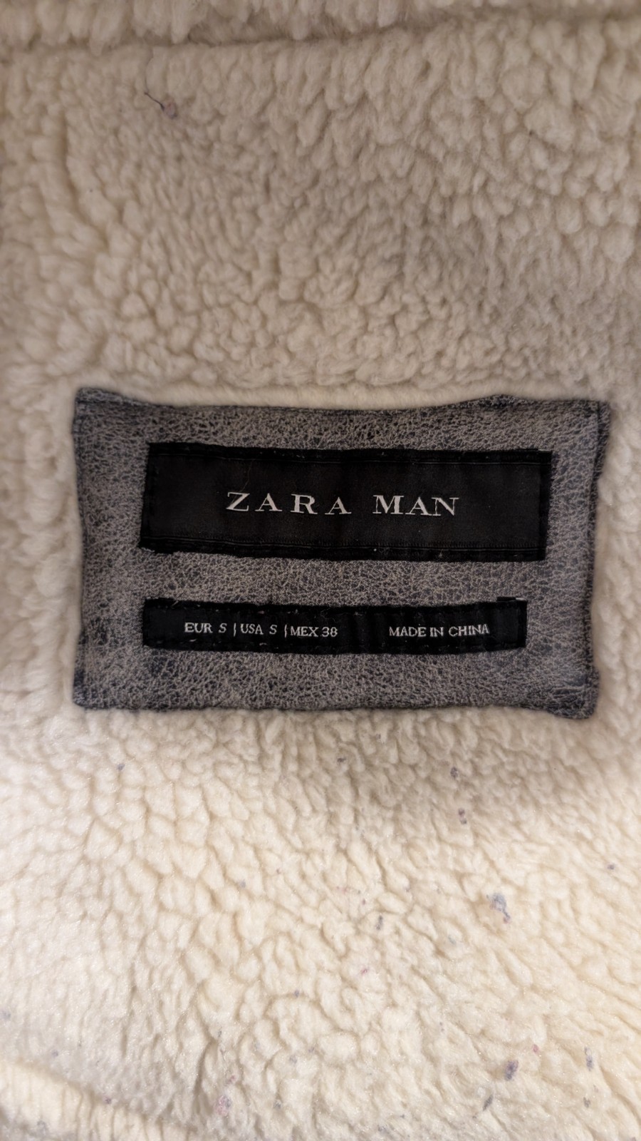 Description: For sale is a heavy, warm Zara Man (Actually I think this is a unisex) winter coat featuring a rugged "distressed" leather look with a full faux-shearling (sherpa) interior. This is a great cruelty-free alternative to a classic B3 bomber or shearling ranch coat. Condition: Condition: 9.5/10 - Great pre-owned condition. Note on Finish: The outer fabric has an intentional "distressed/weathered" finish to mimic vintage leather. Features: Full Sherpa Lining: The thick faux fur runs through the entire body and collar for maximum warmth. Vintage Aesthetic: Distressed grey/brown faux suede exterior gives it a rugged, lived-in look. Styling: 3/4 length (hits below the hip), button closure, and fold-over shearling cuffs. Pockets: Two large front patch pockets. Shipping: This is a heavy, substantial coat. Will be shipped carefully to ensure it arrives ready to wear.