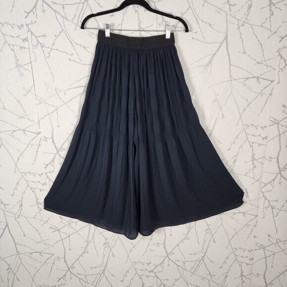 Zara Navy Crinkle Pleated Chiffon Pull On Flowy Palazzo Pants style tags: festival, Y2K, grunge, vacation, loose fit, flowy Women's XS Waist: 25" (elastic) Rise: 13.5" Inseam: 21" Good used condition: no rips, marks or stains.