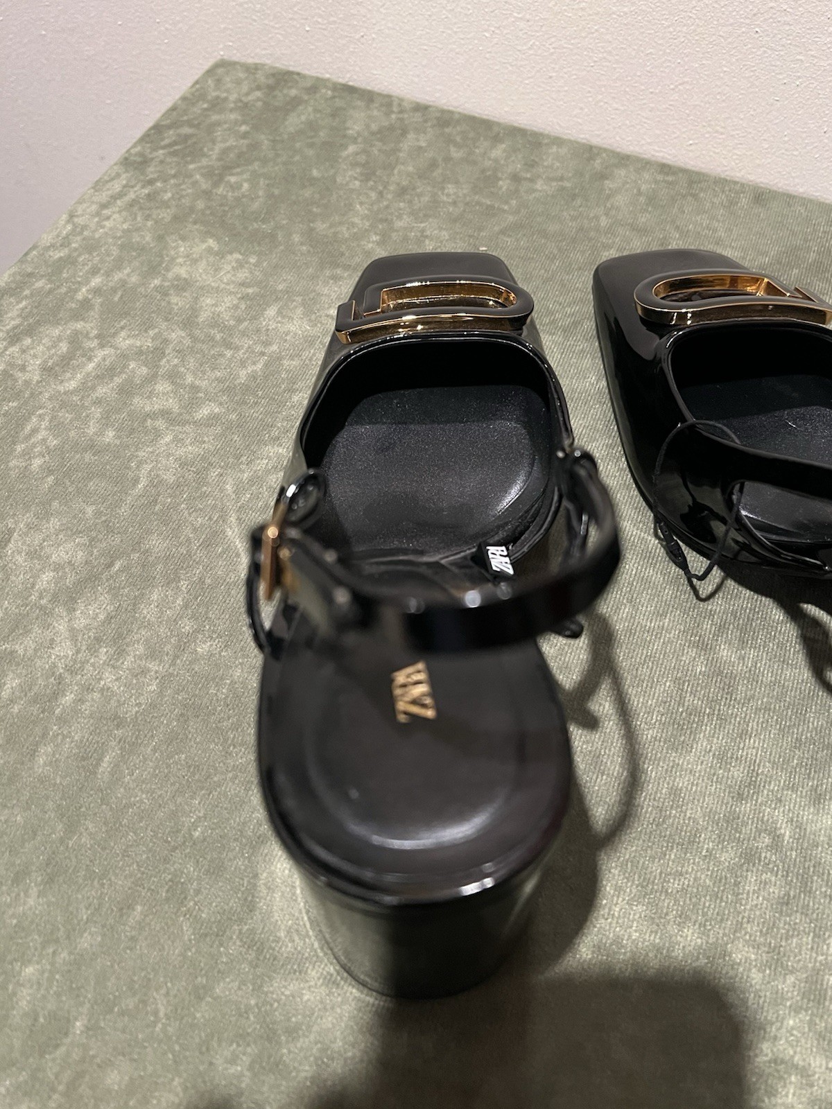 The Zara Patent Finish Mary Jane Block Heel is a stylish and versatile shoe perfect for various occasions. This new without tag pair features a solid black color with a square toe and a block heel, offering a comfortable heel height. The Mary Jane style with adjustable ankle strap and buckle closure adds a touch of sophistication, making it a great choice for travel, parties, casual outings, workwear, and business meetings. Made from faux leather with a patent finish, these heels are sure to elevate any outfit, whether for a winter event or a summer party.