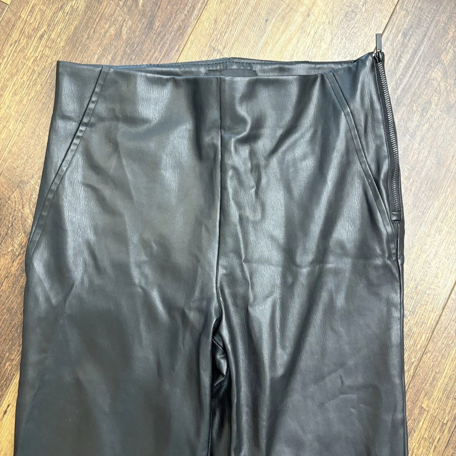 The Zara Women’s Black Faux Leather Pants in size S feature a wide-leg flare design with a side zipper closure. Made from polyester fabric, these stylish pants are perfect for both casual and party occasions. The high-rise waist and regular fit offer a comfortable and flattering silhouette, while the black color and solid pattern add a versatile touch to any outfit. Perfect for the winter, fall, and spring seasons, these pants are a must-have addition to any fashion-forward woman's wardrobe.