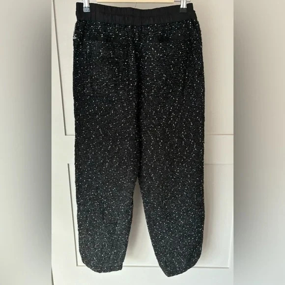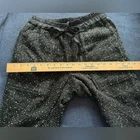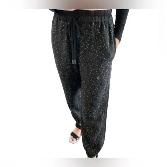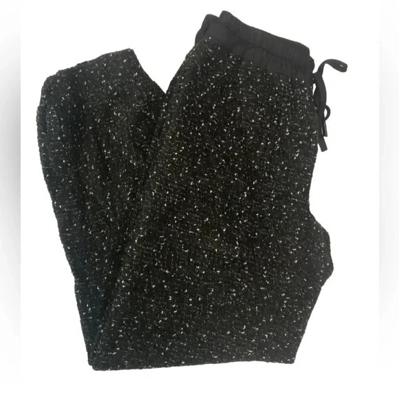 Super Cute joggers can be dressed up or Down Drawstring waist Textured with a bit of sparkle Mid rise Elastic hem at ankles Inseam approximately 26.5 inches 70% Polyester 15 % Cotton 14 % Acrylic 1% Elastane