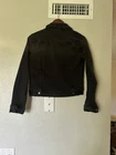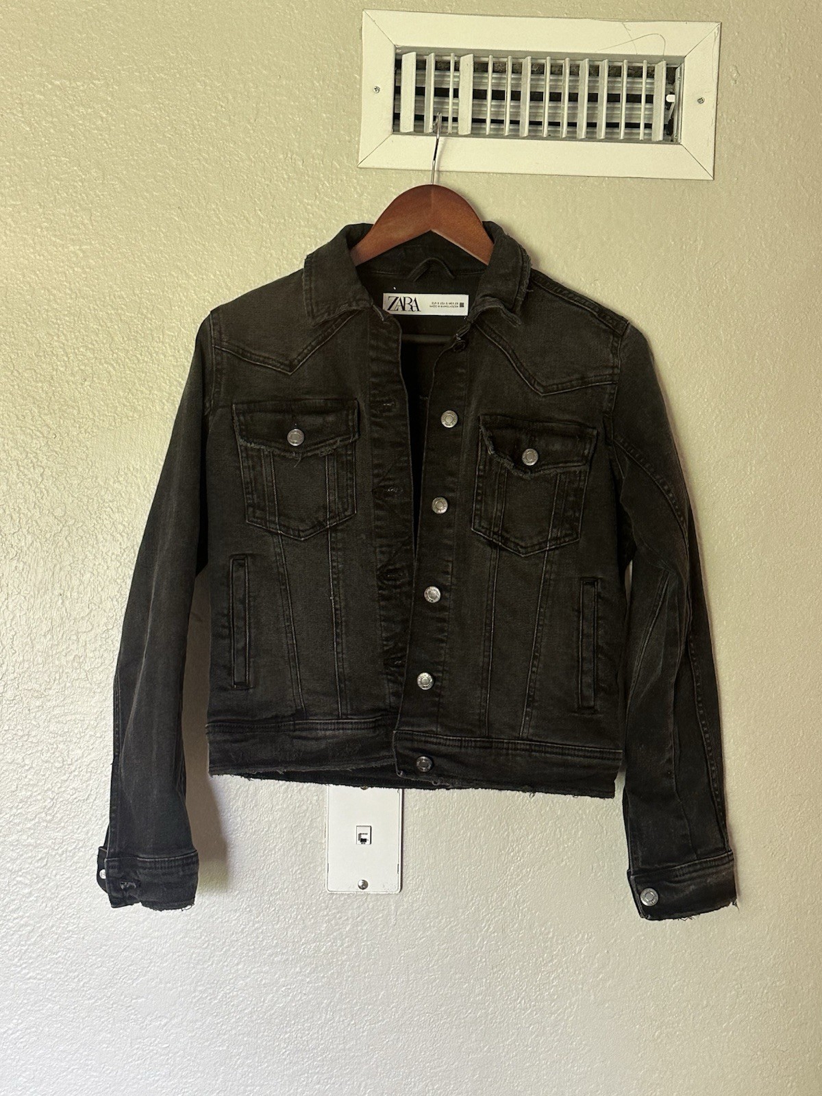 This Zara Women's Jeans Jacket in size Small is a versatile black cotton jacket designed for women. The basic jacket style offers a practical and stylish option for everyday wear. Made by the popular brand Zara, known for quality and fashion-forward pieces, this jacket is sure to become a staple in any woman's wardrobe.