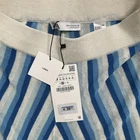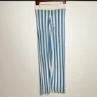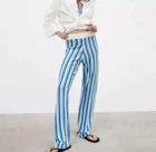 These Zara Women’s Striped Linen Blend Pants in size M feature a relaxed fit with a high rise and straight leg. Ideal for travel and casual wear during the summer, fall, and spring seasons. Made in China, the pants have an elastic waist for comfort and are machine washable. The blue pants have a beach theme and are perfect for a resortwear look. Measurements: Waist 14 Front rise 12 Inseam 32 Out seam 43