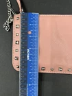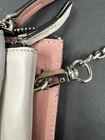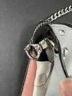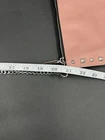 This stylish Zara Women's Small Crossbody Purse Bag is perfect for any occasion. With a beautiful pink and gray exterior, it features studded accents that add a touch of edginess to the overall design. The bag is made of high-quality leather and has a zip closure to keep all your belongings secure. The bag has a metal chain strap, which complements the silver handle/strap color and pink hardware color. It also has inner pockets and dividers, making it easy to organize and find your belongings. The bag measures 10 inches in width and 6 inches in height, making it the perfect size for a night out or a quick trip to the store. The bag is perfect for women and is a must-have addition to any collection.