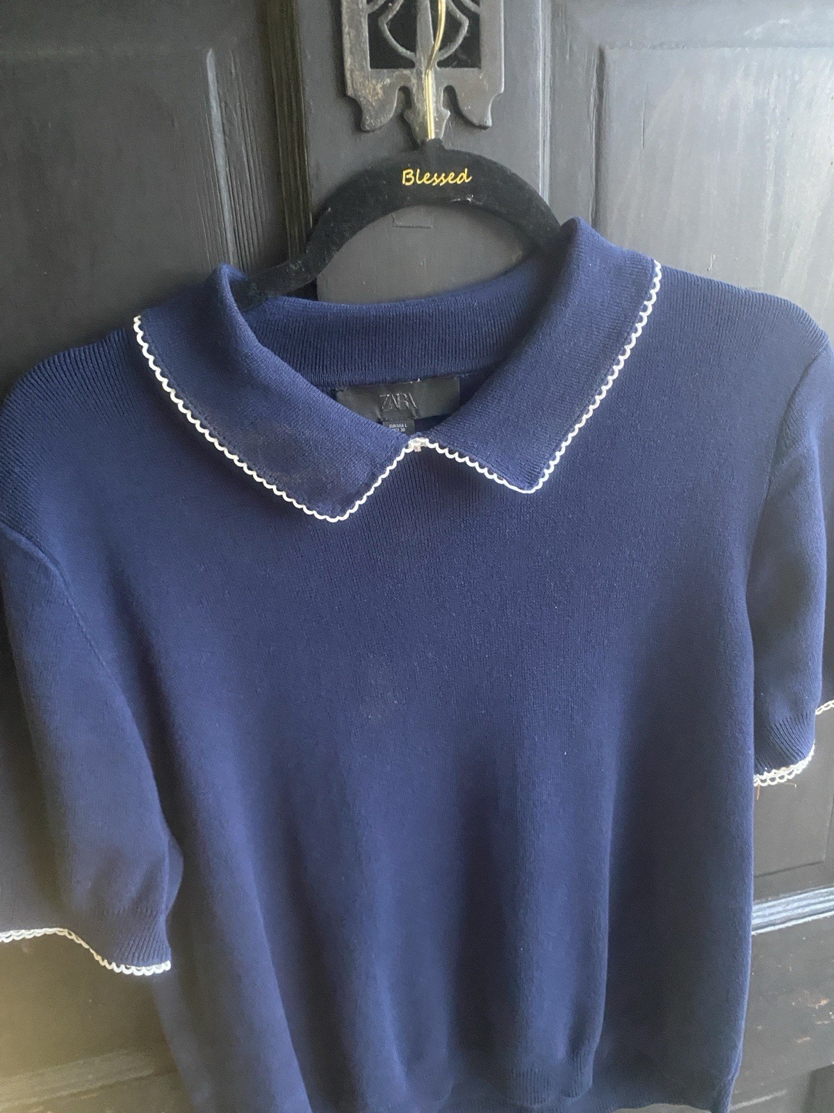 The Zara blouse is a solid blue, short sleeve top with a round neck and pullover closure. It is designed for casual occasions and is machine washable. The blouse features embroidered accents and is made of knit fabric. With a regular fit and size L, this classic blouse is perfect for the summer and spring seasons. Made by the popular brand Zara, this basic top offers a timeless and versatile style for women.