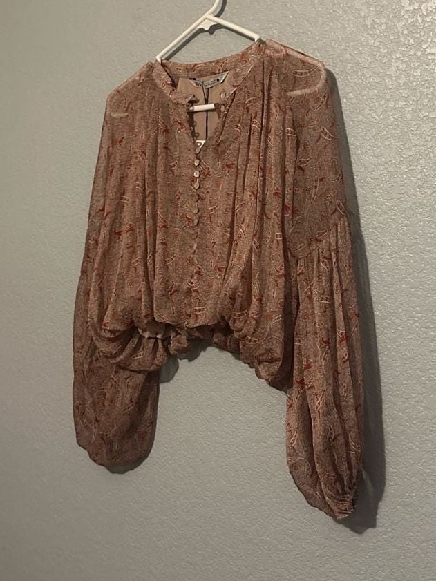 NWT Zara Paisley Print Voluminous Blouse, Neutral Multi, Size L — Boho-chic style with sheer finish. This stunning Zara top features a delicate paisley pattern in warm neutral and terracotta tones. Designed with oversized balloon sleeves and an elasticated hem for a cropped, voluminous look. The front is finished with a row of stylish button fasteners and a classic round neckline. Crafted from 100% polyester for a lightweight, airy feel. Perfect for layering over a camisole or pairing with high-waisted denim for a modern bohemian aesthetic. Brand new with tags attached. Excellent condition with no flaws.