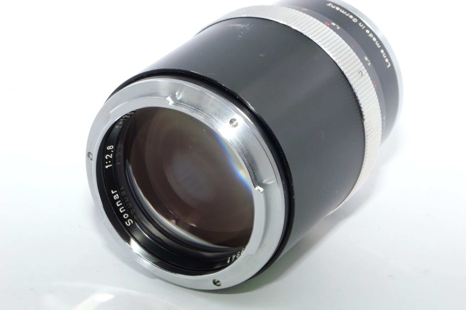 Carl Zeiss Olympia Sonnar 135mm f / 2.8 thelephoto le . Serial # 4219941. Made in Germany. This Sonnar telephoto lens will fit camera's like Contax Contarex, Contax Bullseye, Contax Special and Contax Professional. This lens can also be used on most mirrorless digital cameras with the proper adapter. Lens has close focusing down to 4 ft, or 1.2m. Aperture f/ 2.8 - f/ 22 . Filter size is B56. This Sonnar has a black body. Lens is Ex or 8 of 10 cosmetic condition. No dings or dents. Couple of small marks around on the lens barrel from prior use. Good shooter lens in overall good condition. Nice clean glass. Clean lens coating with no detectable marks or scratches. Clean and smooth six(6) aperture blades. Smooth focus. Also included is a Contarex lens booklet, Zeiss Proxar close-up lens, front lens cap, and B56 skylight filter, and green filters. Nice sharp Contarex 135mm f/2.8 telephoto lens to go with your vintage Zeiss Contarex camera. Sells with NO RESERVE at a price of $375. I have more interesting Contax Rangefinder and Reflex cameras, Contax lenses and Contax accessories on my other Auctions, E-bay Store and web page.