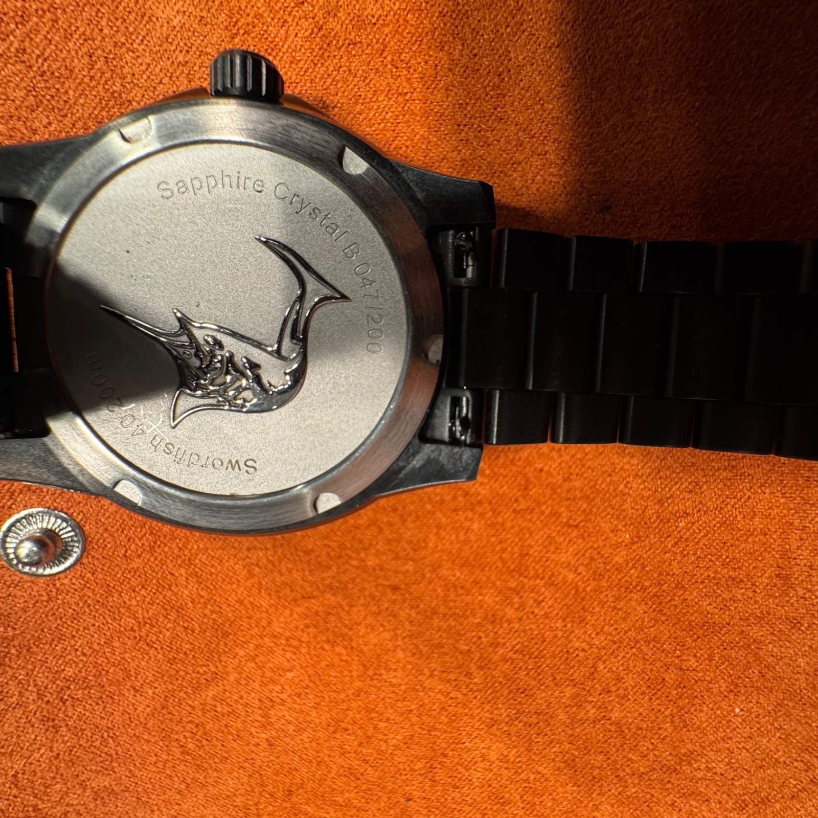 RARE Limited drop Swordfish 40mm. Meteorite Dial. Very hard to find! From up and coming micro brand Zelos. Dark stealth grey with orange. Amazing condition. Rarely worn. Travel case and original links included.