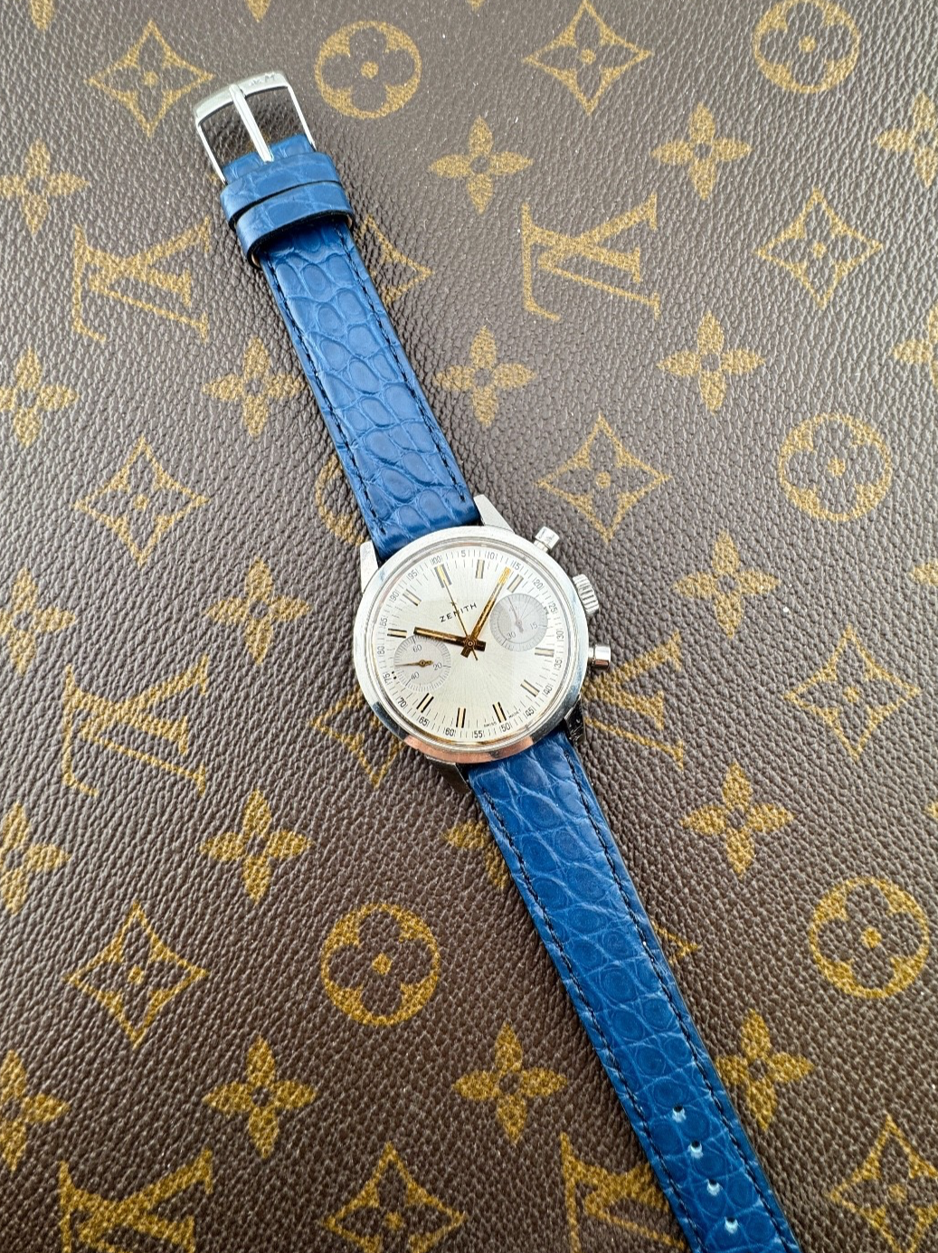 PROPONIAMO; -Marca: ZENITH CRONOGRAFO -Cassa: ACCIAIO DA 37MM , FONDELLO A VITE ORIGINALE -Movimento :ZENITH ORIGINALE CALIBRO 146 D -Vetro:PLEXY -Corona:ORIGINALE -Ghiera: LISCIA(MONETA) -Tasti: POMPA ORIGINALI -Quadrante: SILVER ORIGINALE TRIZIO -Lancette:ORIGINALI -Cinturino/Bracciale:STAMPA COCCODRILLO NUOVO BLU DA 18MM GENERICO NUOVO -Scatola e documenti: NOSTRA POCHETTE IN VELLUTO COMPRESA -Condizioni : OTTIME -Revisionato:SI -Uomo/donna/unisex:UOMO PER QUALSIASI DUBBIO CONTATTATEMI ,RISPONDEREMO IL PRIMA POSSIBILE