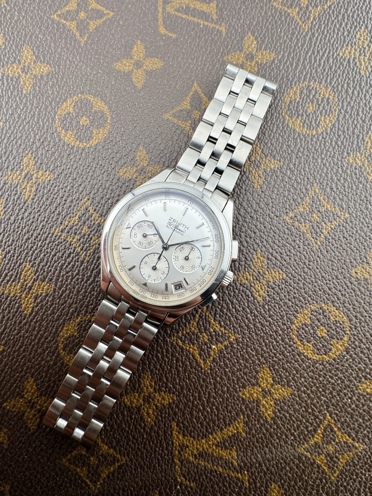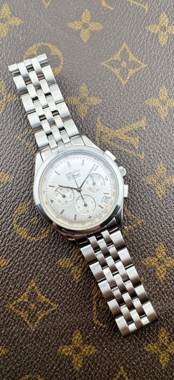 PROPONIAMO; -Marca: ZENITH EL PRIMERO -Cassa: ACCIAIO INOX DA 38MM ESCLUSA CORONA , FONDELLO A PRESSIONE ORIGINALE CON VETRO ZAFFIRO -Movimento :ORIGINALE ZENITH CALIBRO 400 , AUTOMATICO COEVO -Vetro:ORIGINALE -Corona:ORIGINALE -Ghiera: LISCIA -Tasti: ORIGINALI RETTANGOLARI -Quadrante: SILVER ORIGINALE -Lancette: ORIGINALI -Cinturino/Bracciale: BRACCIALE ACCIAIO INOX DA 38MM , DOPPIA CHIUSURA DEPLOYANTE ADATTO A POLSI FINO A 19 CM -Scatola e documenti: NOSTRA POCHETTE IN VELLUTO COMPRESA -Condizioni : OTTIME -Revisionato:SI -Uomo/donna/unisex:UOMO PER QUALSIASI DUBBIO CONTATTATEMI ,RISPONDEREMO IL PRIMA POSSIBILE