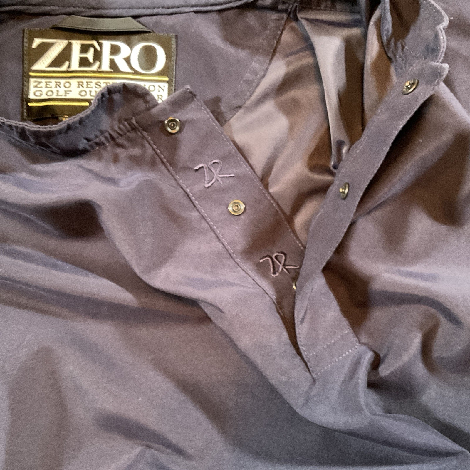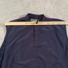 The product is a men's windbreaker vest made by Zero Restriction. It is a vintage vest in solid blue color with embroidered logo accents and a stand-up collar style. The vest has a mid-length cut and is made of polyester microfiber fabric with a polyester lining and insulation material. It features a button closure, quick dry and breathable properties, and is water-resistant and wind-resistant. The vest has pockets and a regular fit, and is machine washable. It is suitable for travel, casual, and workwear occasions, and for outdoor activities such as tennis, walking, golf, and hiking.