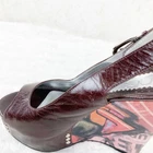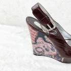 Minor wear & creasing, great condition overall Zinc Slingback peep toe wedges Leather Unique graffiti newspaper art pattern, soft suede like material at the wedge Size 8.5 Buckle strap Stud accents 5.5” heel