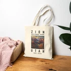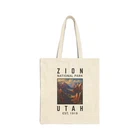 A durable and stylish tote bag featuring a graphic of Zion National Park Utah EST 1919. Perfect for nature lovers and outdoor enthusiasts looking to showcase their love for national parks. Ideal for daily use, grocery shopping, or as a beach bag. Great for travel or as a gift for someone who enjoys exploring the great outdoors. Relevant for holidays like National Parks Week and Earth Day. Product features - Made from 100% cotton canvas for durability - Flat corners for a seamless design - Reinforced carrying handles for easy transport - Heavy fabric for sturdiness (12 oz/yd²) - Available in natural and black Care instructions - Do not iron directly over the printed area - print may stick to the iron. - Spot clean - Do not bleach - Line dry