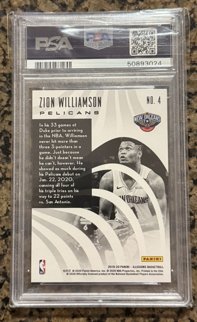 The product is a 2019 Panini Illusions Zion Williamson Rookie Vision Holo Foil trading card, graded as a PSA 10 with a population of 46. This single sports trading card features a holographic foil design and is a part of the Panini Illusions series. It showcases the basketball player Zion Williamson from the New Orleans Pelicans in the NBA, making it a valuable collectible for fans and collectors alike.