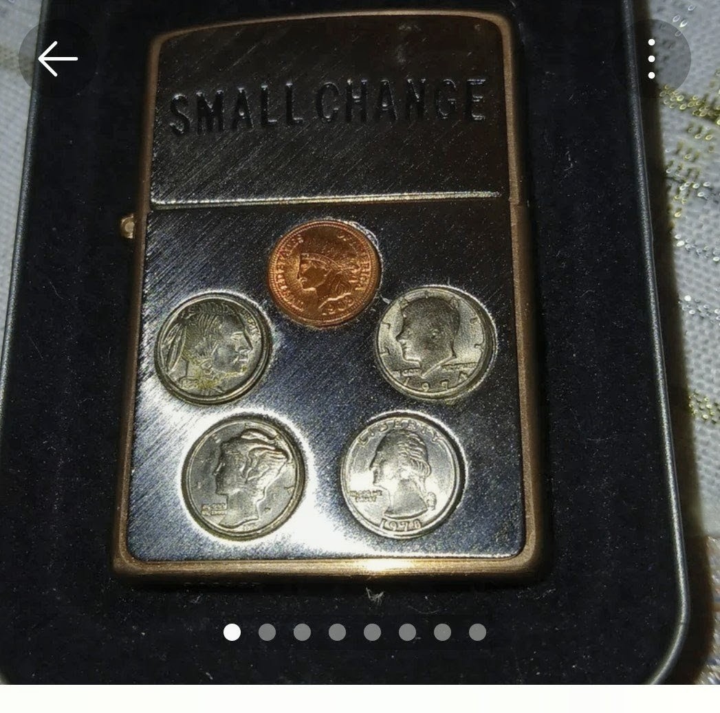 Vintage Zippo lighter is solid copper and it's called "Small Change" because it has one of each coin in a mini version going around in a circle on the front of it. Made in 2003 this Lighter is in great condition and the original box has some rust areas.