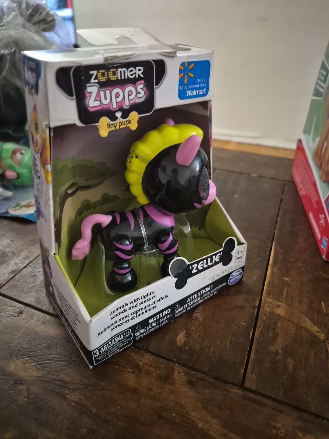 The Zoomer Zupps Safari Pets Interactive Zebra "Zellie" is an electronic toy that provides interactive play for children aged 4 and up. Produced by Spin Master, this toy features lights and sounds to engage kids in imaginative play. With its character from the Zoomer Zupps family, Zellie adds a fun and interactive element to playtime for young children.