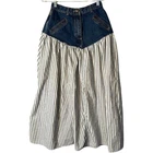Vintage, please confirm measurements 26" waist 35" waist to hem 7" rise excellent condition, no flaws a.b.s. vintage denim skirt ** features a striped pattern of blue & white with solid denim at waist to hips ** bohemian style and full silhouette ** high-quality cotton denim, ** pockets ** zip front with button close, belt loops ** machine washable ** made in the United States ** all items stored in a smoke-free & pet free home