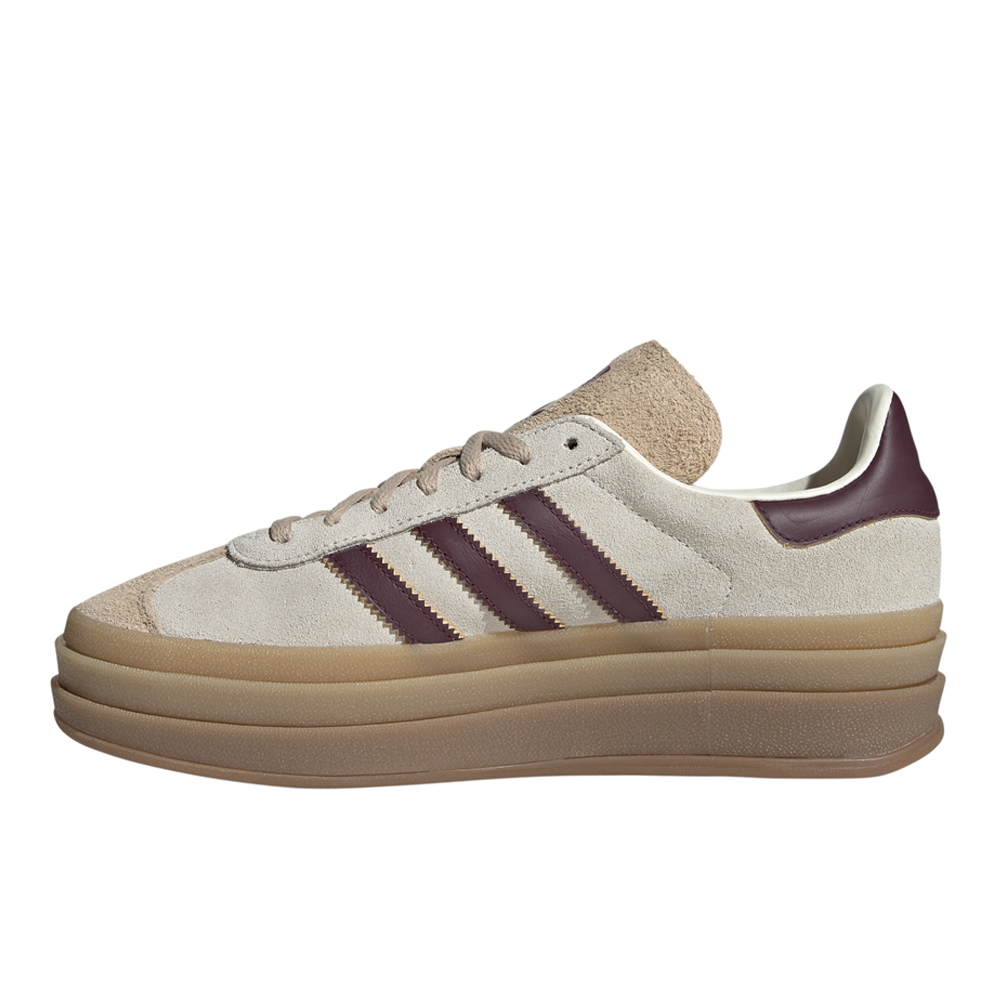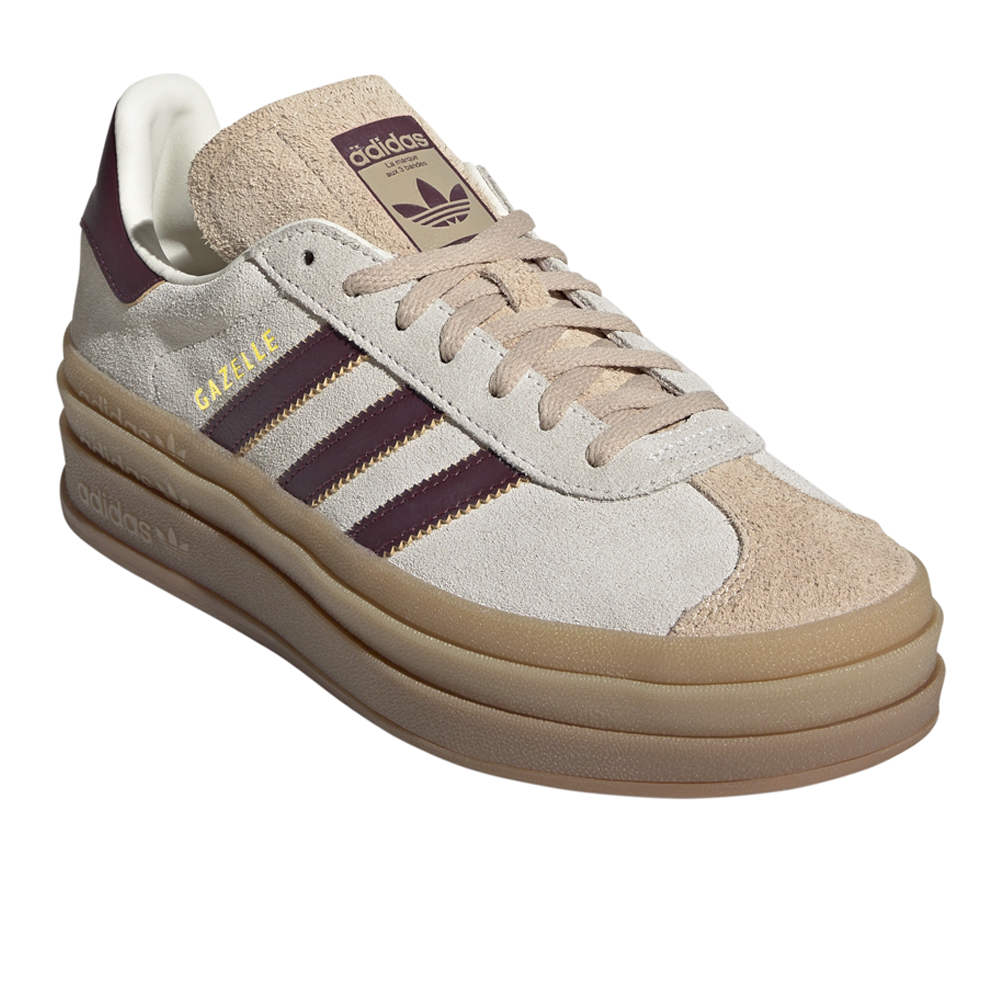 Gazelle Bold Lace Up Sneakers Product Details Suede upper Lace closure Synthetic lining Rubber outsole Color: Cream White/Maroon Doesn't matter if it's a coffee run or a night out, step out in style with these adidas Gazelle Bold sneakers. A retro design from the archives, the shoes are crafted with suede in vibrant colors for a statement look. Signature details like the serrated 3-Stripes and T-toe nod to the shoe's sport heritage. The chunky outsole adds drama to any outfit. Additional Details Manufacturer Color: Cream White/Maroon Color: Beige Occasion: Casual Gender: Womens Age: Adult Brand: