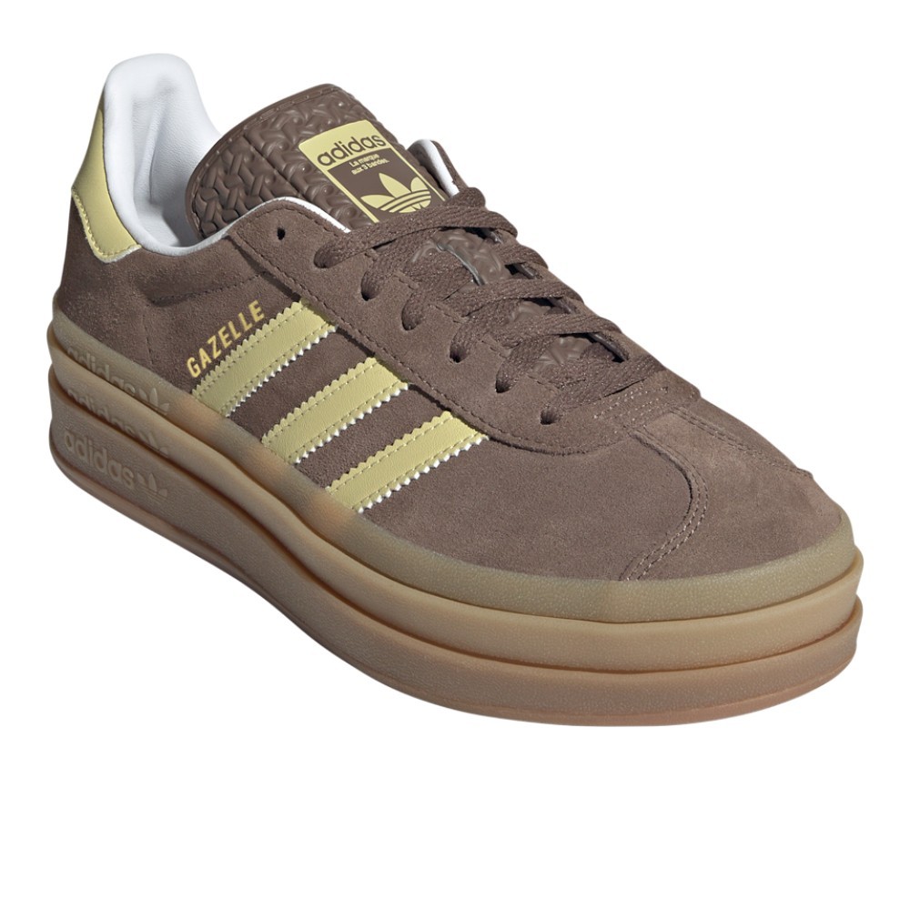 Gazelle Bold Lace Up Sneakers Product Details Suede upper Lace closure Synthetic lining Rubber outsole Color: Earth Strata/Powder Yellow Doesn't matter if it's a coffee run or a night out, step out in style with these adidas Gazelle Bold sneakers. A retro design from the archives, the shoes are crafted with suede in vibrant colors for a statement look. Signature details like the serrated 3-Stripes and T-toe nod to the shoe's sport heritage. The chunky outsole adds drama to any outfit. Additional Details Manufacturer Color: Earth Strata/Powder Yellow Color: Brown Occasion: Casual Gender: Womens Age: Adult Brand: