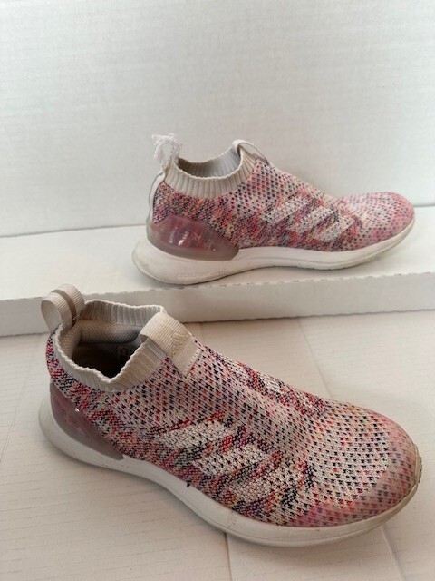Used Adidas tennis shoes with a fraying on the heel pull tag on the left shoe.
