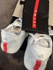 adidas A+P Luna Rossa 21 sneakers Prada. Size - 6 US Ship world wide Pick up available Light, flexible and made with components manufactured from Primegreen recycled materials, the A+P Luna Rossa 21 sneaker produced in collaboration with adidas blends iconic elements of the two brands in a style inspired by the sailing world. Reminiscent of the iconic design of the Prada America's Cup boat shoe of 1997, it has a hydrophobic shell that encases the upper inspired by an ergonomic adidas shape. The shoe comes in special packaging, accompanied by a shoe bag made of technical fabric with logo print, that can turn into a versatile accessory. Product code: 3E6447_OYQ_F0002_F_005 Upper and lining in Primegreen, made of recycled materials Heat-sealed and rubberized details Transparent shell in TPU: a hydrophobic, thermoplastic, flexible and resistant material BOOST midsole Rubber sole EVA ergonomic tongue adidas logo on the back Prada Linea Rossa logo Resistant, waterproof technical fabric shoe bag