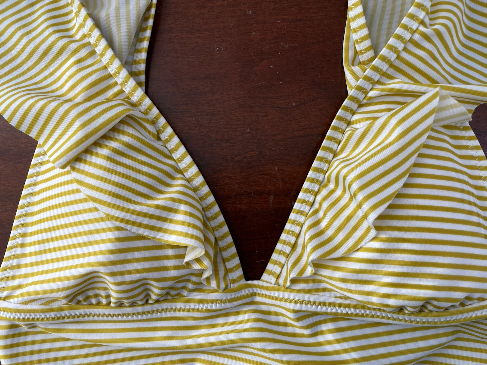 aerie Women's Striped Ruffle Adjustable Strap Padded Triangle Bikini Top Yellow S. Condition is pre-owned. Smoke free, pet free home. Shipped via USPS Ground Advantage. In very good condition. Free of rips or stains.