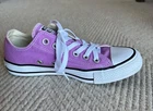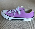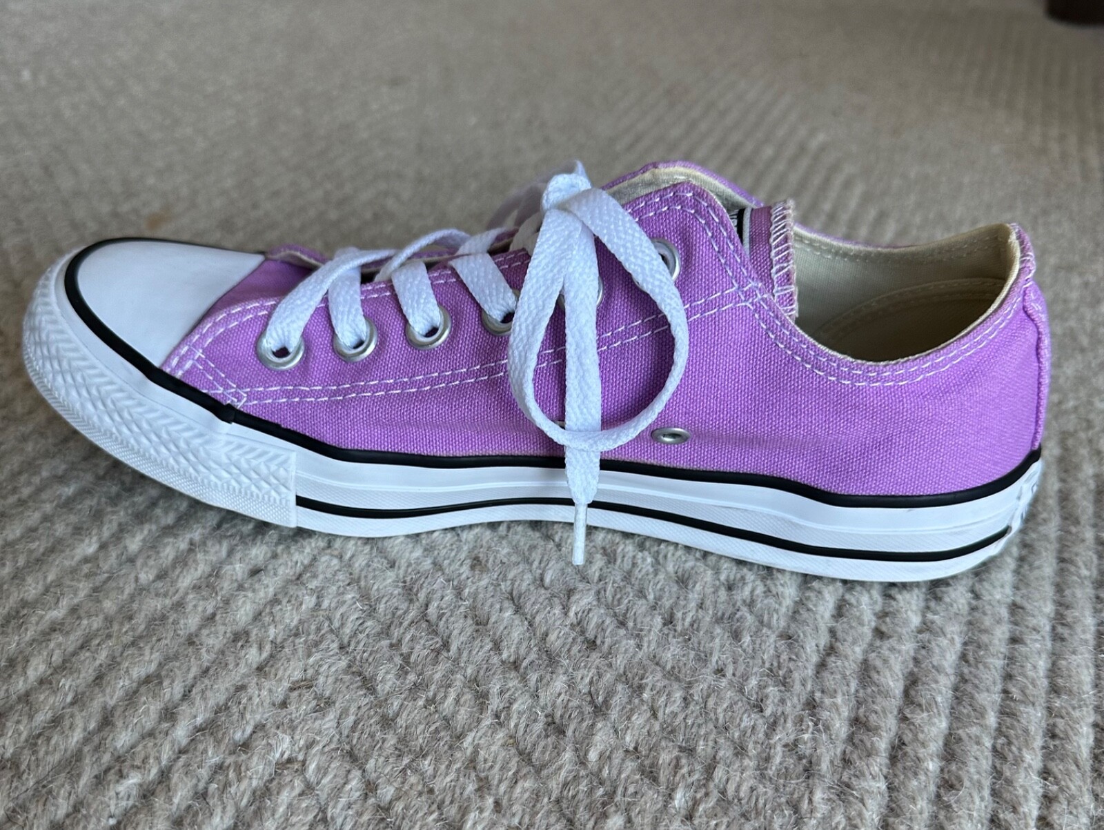 The product is a pair of unisex Converse Chuck Taylor sneakers in a vibrant Amethyst Purple color. They feature a low top style with a lace-up closure and a rubber outsole. These athletic shoes have a standard shoe width and are made with canvas as the upper material. The sneakers are in UK size 5, US Men’s size 5, and EU size 37.5, suitable for both men and women who enjoy a classic and stylish sneaker option with a touch of star-themed design. The shoes are part of the Converse Chucks All Star Chuck Taylor product line. They are lightly worn but look brand new.