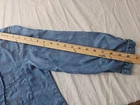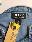 The a.n.a A New Approach Lyocell Chambray Shirt is a stylish women's tunic top in a medium size, featuring a classic/fitted sleeve design with a V-neckline and lace-up closure. Made from lightweight lyocell fabric in a solid blue color, this blouse is perfect for casual or travel occasions during the summer, fall, and spring seasons. The top also includes button accents and embodies a Western or boho style, making it a versatile and comfortable addition to any wardrobe.