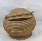 antique early coil basket w/lid Southeast Native American 11.5 across original antique early coil Southeast Native American basket with fitted lid 1. good condition not perfect 2. excellent color 3. dark on the outside from being exposed and used, lite on the inside of the bowl and inside of the lid where not exposed 4. coils are wrapped around many pieces of wide grass, could be rye grass 5. these were made to be water tight, I have not tested this 6. they were also made to hold hot rocks, again I have not tested this 7. very solid and sturdy 8. this has an aroma inside, someone stored something aromatic in it 9. lid fits well, see the flange to hold it in place 10. I have shown the ending ends of the top and top of bowl, see photo 11. ending coil on the bottom has come undone, see photo, this could be fixed, but is does allow you to view the grasses 12. basket is very strong and you can tell by the color that it has age approximate measurements 1. top without the lid on 11.5 in. 2. around the middle 37 in. 3. height to top with lid on 10 in. 4. height to top without the lid 8 in. 5. coils about 3/8 in. across ground advantage or priority shipping and handling in US scroll down for larger photos You may be interested in our other eBay listings . I send a note at the end of the sale with payment information. Payment is expected within 2 days. We ship promptly within 1 day on receipt of payment. All US packages have tracking and are insured. International Buyers We ship international with United States Postal Services. USPS First Class postage and Flat Rate Priority Boxes or Envelopes can now be tracked to some countries . International packages over $100 ship priority or express. Contact us for more information. Import duties, taxes and charges are not included in the item price or shipping charges. These charges are the buyer’s responsibility. Please check with your country’s customs office to determine what these additional costs will be prior to bidding/buying.” . Powered by SixBit's eCommerce Solution