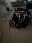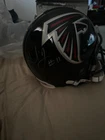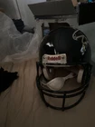 The product is a Riddell open face football helmet in black, featuring an autograph. It is a one size helmet with a chin strap attachment, suitable for football activities.