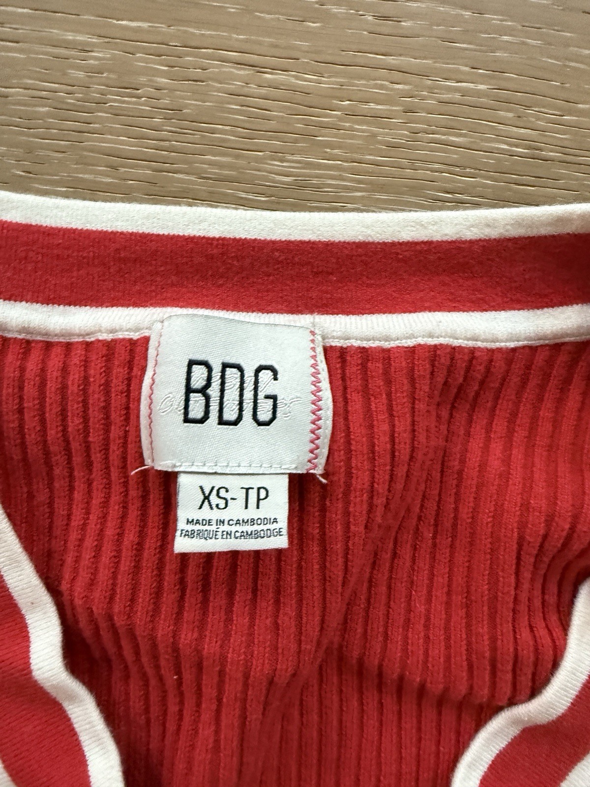 The product is a red striped V-neck long sleeve sweater from Urban Outfitters in women's size XS. This pullover sweater is designed for women and features a classic v-neckline and long sleeves, making it a versatile and stylish addition to any wardrobe. The red and white striped pattern adds a pop of color to the outfit, while the size XS ensures a flattering fit for the wearer. Perfect for casual or dressier occasions, this sweater is a must-have piece for any fashion-forward individual.