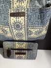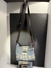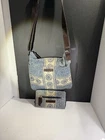 This Bella Taylor crossbody bag and matching wallet set is the perfect addition to any stylish woman's collection. The exterior is made of durable cotton material with a quilted finish, and features a beautiful blue color that is sure to catch everyone's eye. The bag comes with a cross-body strap that can be worn comfortably on the shoulder or across the body, and has a spacious interior measuring 11x10 inches. In addition to the cross-body strap, this bag also features multiple compartments for storing your everyday essentials, as well as a matching wallet that can hold all of your cards and cash. This set is ideal for anyone who wants to stay organized and fashionable on the go. Wallet 8 x 4.5“ wallet and purse in good condition. See pictures.