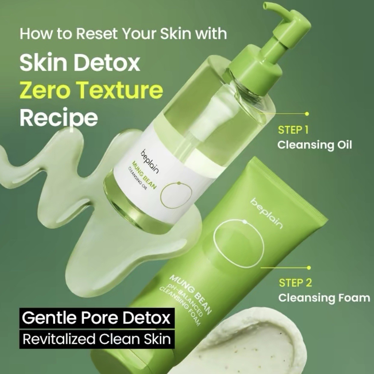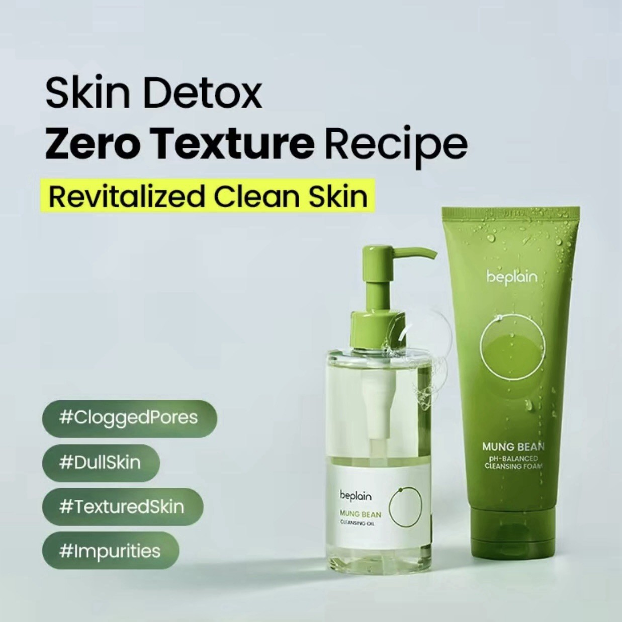 Skin Detox "Zero Texture" Recipe From light cleansing to heavy makeup! Reset your skin with our gentle yet powerful Oil & Foam Skin Detox recipe + #CloggedPores #DullSkin #TextureSkin #Impurities SET COMPOSITION Mung Bean Cleansing Oil 200ml, Mung Bean Cleansing Foam 160ml RECOMMEND SKIN TYPES Ideal for all skin types, especially for: • Those seeking a gentle yet thorough cleansing experience that detoxifies the skin. • Those looking for effective makeup removal without irritating the skin. • Those who want to keep their skin hydrated after cleansing. ABOUT THIS DUO Non-comedogenic test completed for both products * 1. Mung Bean Cleansing Oil Ideal for Sensitive Skin: Formulated with Whole Mung Bean Complex, Allantoin, and Panthenol to enhance moisture retention and protect the skin barrier after cleansing. Lightweight Formula: Emulsifies perfectly into a milky texture, effortlessly removing even stubborn makeup while leaving your skin with a non-greasy, dewy finish.