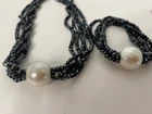 This black beaded necklace and bracelet set features one large pearl pendant. The jewelry set is handcrafted with metal and acrylic beads, perfect for occasions like engagements, graduations, and birthdays. The lobster closure ensures easy wearing, while the bar pendant design adds a touch of elegance to the overall beaded style.