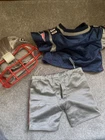 Get ready to cheer on your favorite team with this Build-A-Bear Workshop Patriots Football Jersey and Helmet set! The set includes a blue, red, and silver jersey and matching helmet, perfect for any 14-inch bear wearing cloth material. The outfit is ideal for any sports-themed collection and is compatible with Build-A-Bear Workshop bears. The red frame on helmet is a lightly bendable rubber. Note the logo on the shirt is worn, as this outfit was a bears go-to attire.