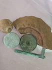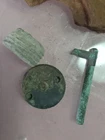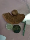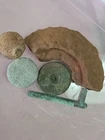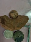 A part of a spherical shell side loader. Brass underplug, lead side plug with threads top part of the shell plus an iron canister shot and friction primer Will add a piece or two fragments from a shell that way 3 pieces of shell