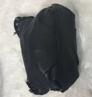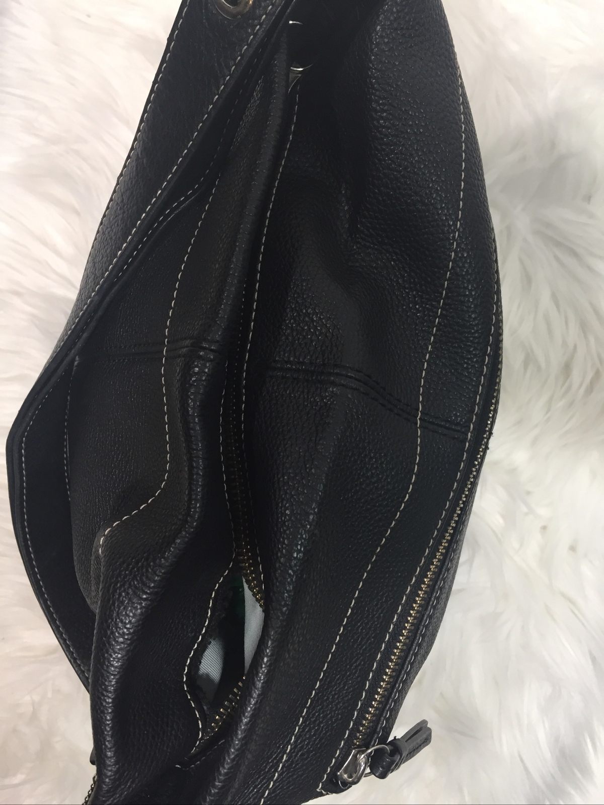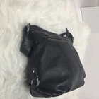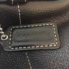 Coach used black leather handbag in very good condition. No scuffs or marks. One Strap Adjustable. 12 inches wide and 12 inches high . zipper is off track. inside has some stains due to normal wear.
