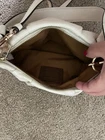 This Coach Outlet handbag is a stylish addition to any woman's collection. The ivory exterior color is complemented by a brown lining color and silver hardware color. The bag features a zip closure and a detachable strap, making it a versatile accessory for any occasion. The medium-sized bag is made of canvas and leather, with a patent leather handle/strap material. It also comes with a bag charm and is part of the Coach Outlet product line. This crossbody bag is perfect for any woman who wants to add a touch of elegance to her everyday style. It does have slight wear on the back and well as a tiny ink stain.
