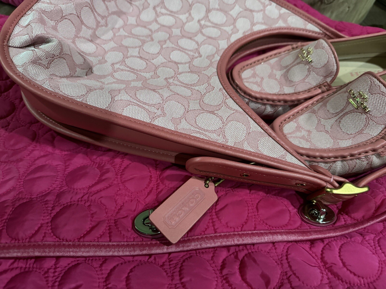 This pink shoulder bag from Coach is a must-have for any fashion-forward woman. With its stylish combination of jacquard and canvas exterior materials, this bag is perfect for any occasion. It's ideal for carrying your everyday essentials and adding a pop of color to your wardrobe. The bag is brand new and comes without tags, making it an excellent gift option for yourself or a loved one. This Coach bag is designed for women and is part of the brand's line of handbags and accessories. It's perfect for pairing with your favorite outfit, whether you're going out for a night on the town or running errands. The bag is a size that can easily accommodate all your essentials, and it has a stylish design that is sure to turn heads. Don't miss out on this must-have accessory for any fashion-conscious woman!