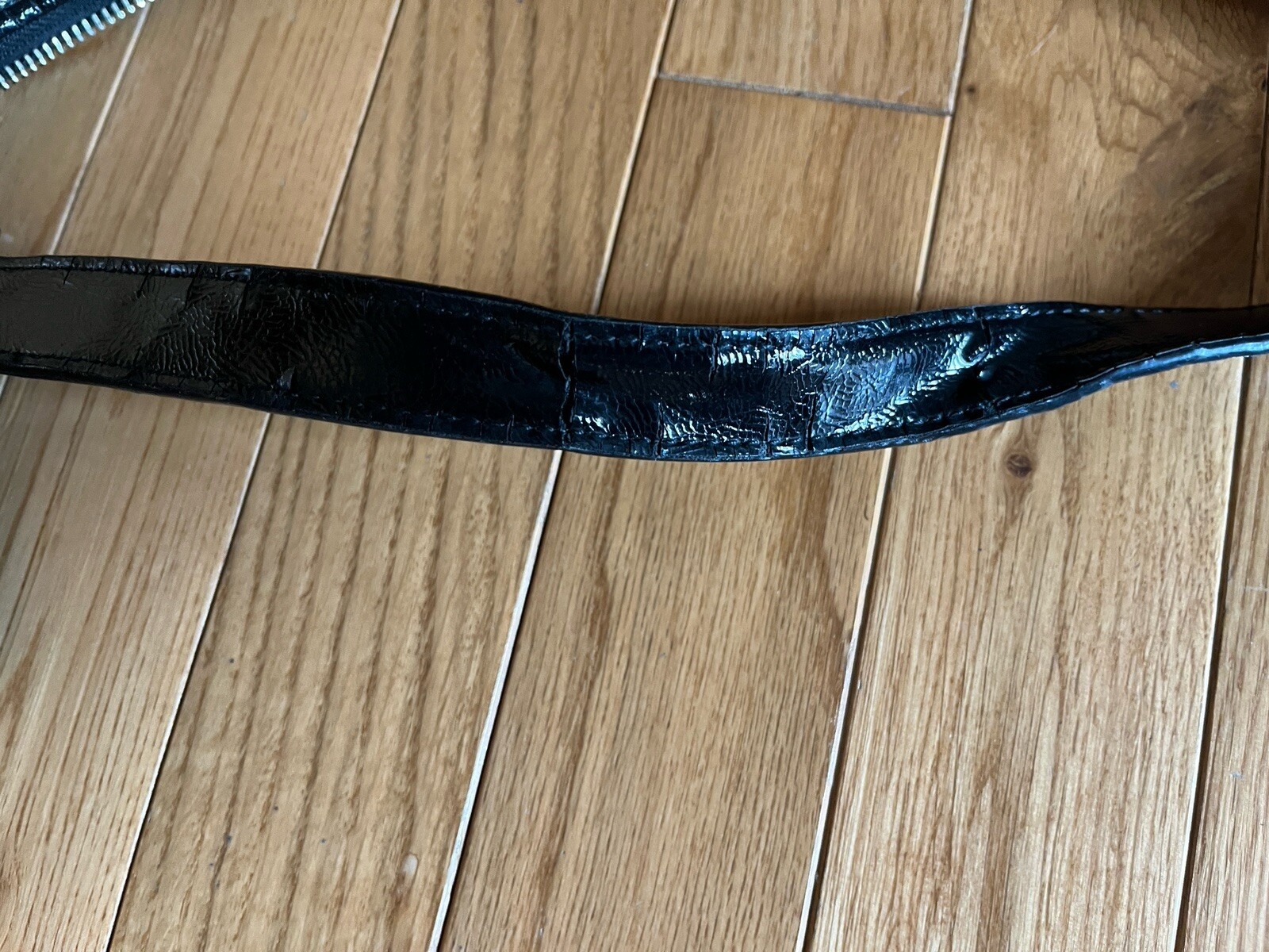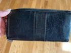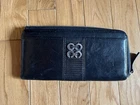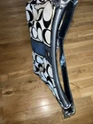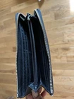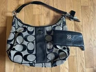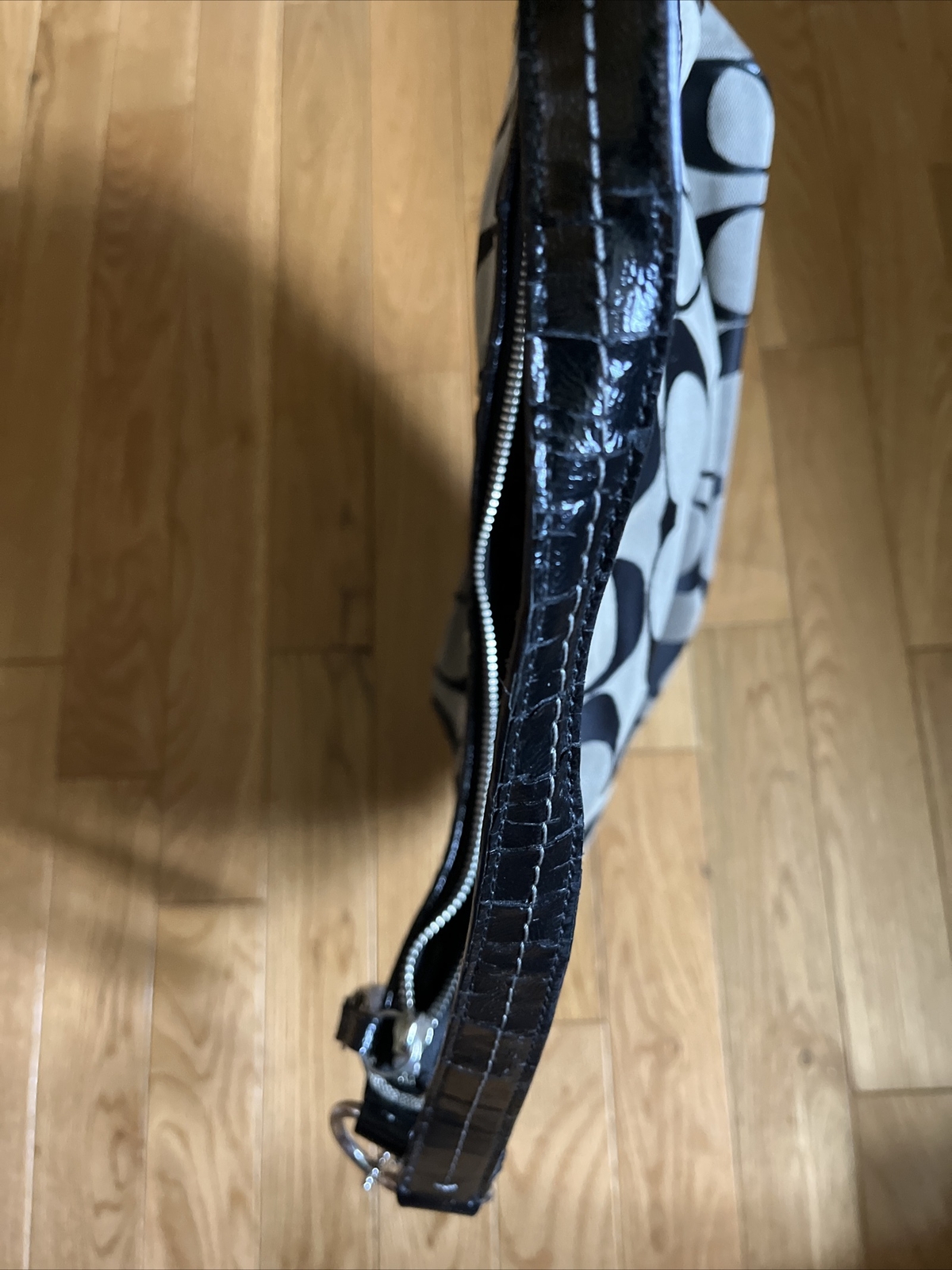 Used black and grey Coach handbag. Top zip closure. There are cracks on the handle strap and around the zip closure. (Please refer to photos) Other then that the handbag is in good condition. Inside the handbag there is zip close slot and 2 open pocket slots. Wallet has 1 front outside slot. Inside there is a middle zip slot and 4 card slots.